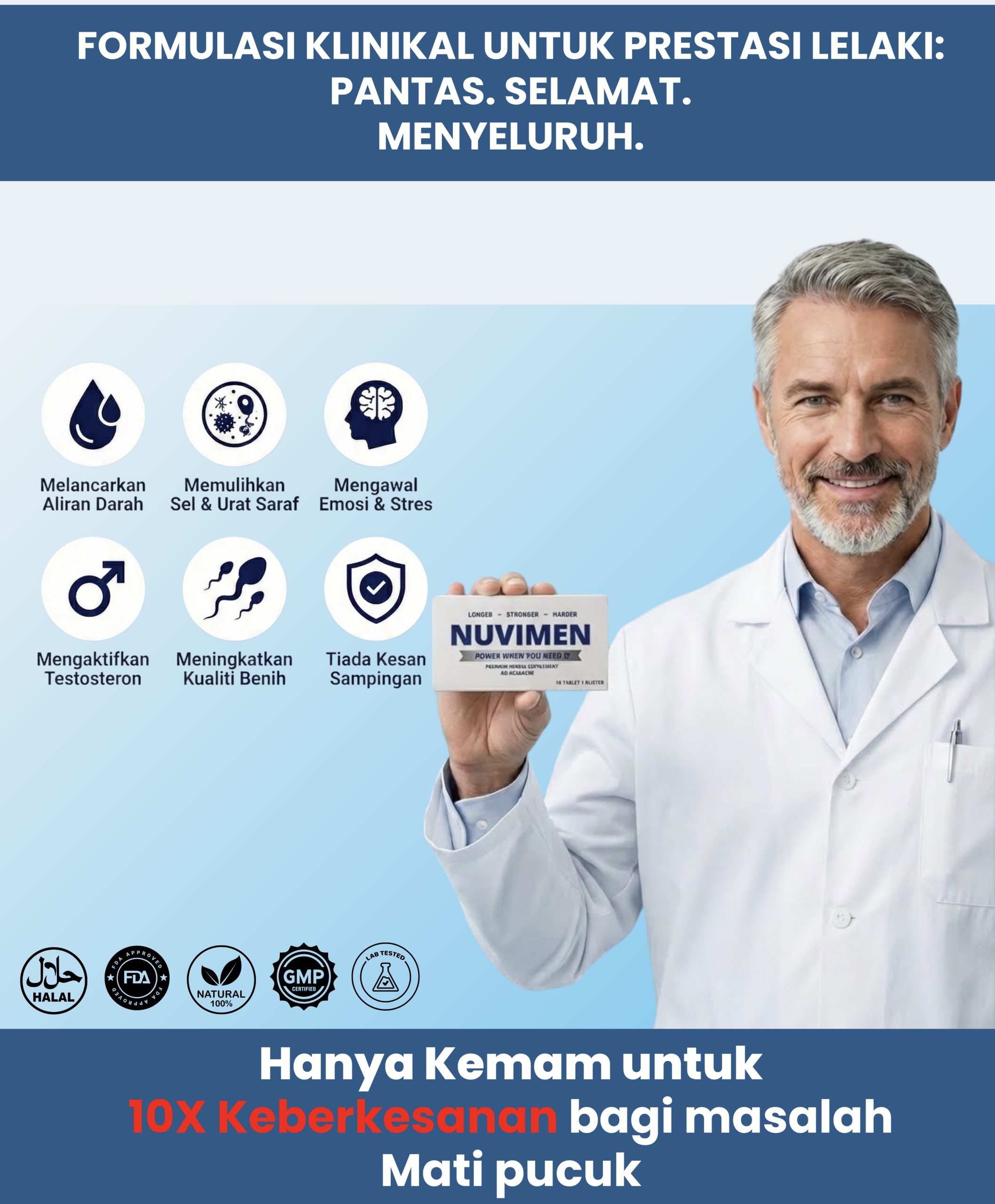 Nuvimen merupakan supplement yang diperakui setaraf dengan pharmaceutical grade dan ubat-ubatan daripada hospital.
