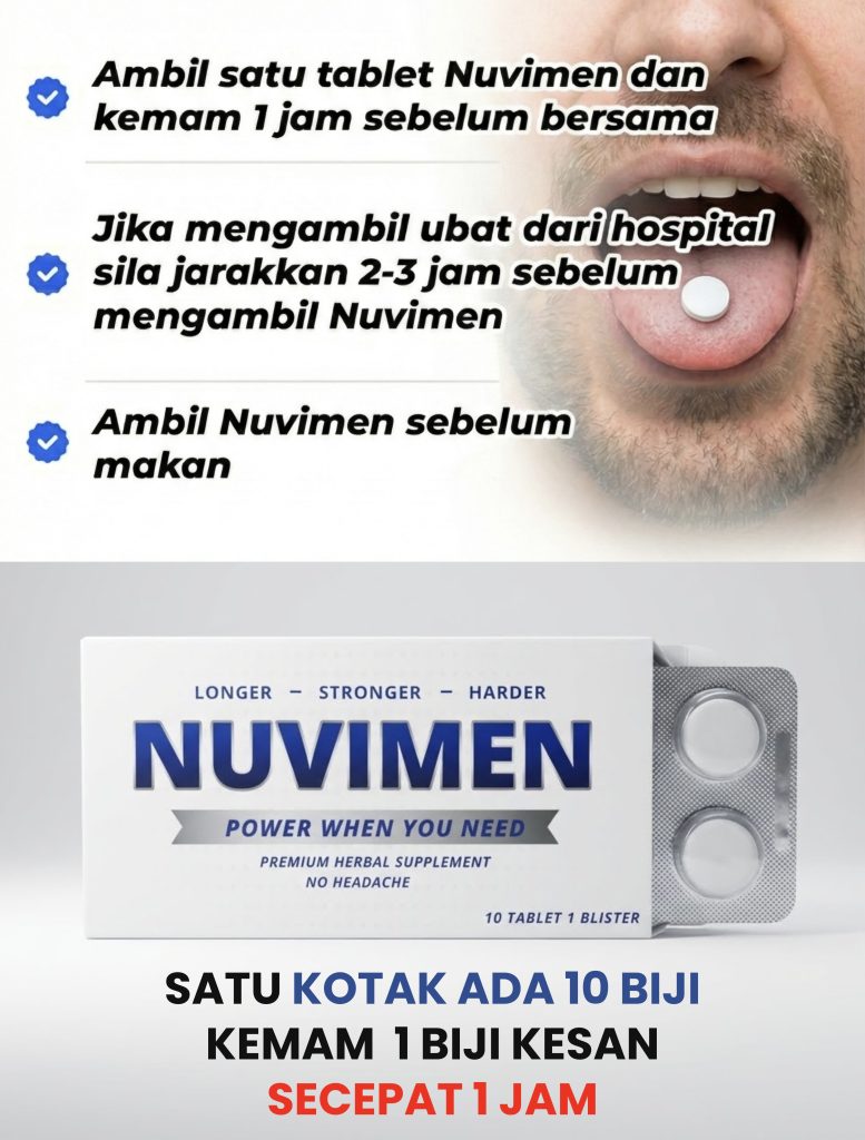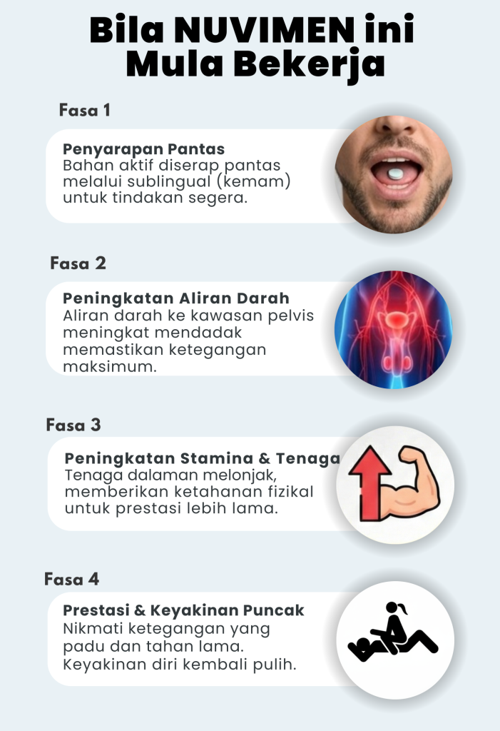 Nuvimen Tablet ini direka untuk memintas sistem pencernaan. Sebaik sahaja cair di bawah lidah, bahan aktif terus memacu aliran darah deras terus ke bahagian zakar anda. Hasilnya? Saluran darah mengembang dengan pantas, menjadikan zakar cepat tegang lebih .Tak perlu lagi menunggu berjam-jam